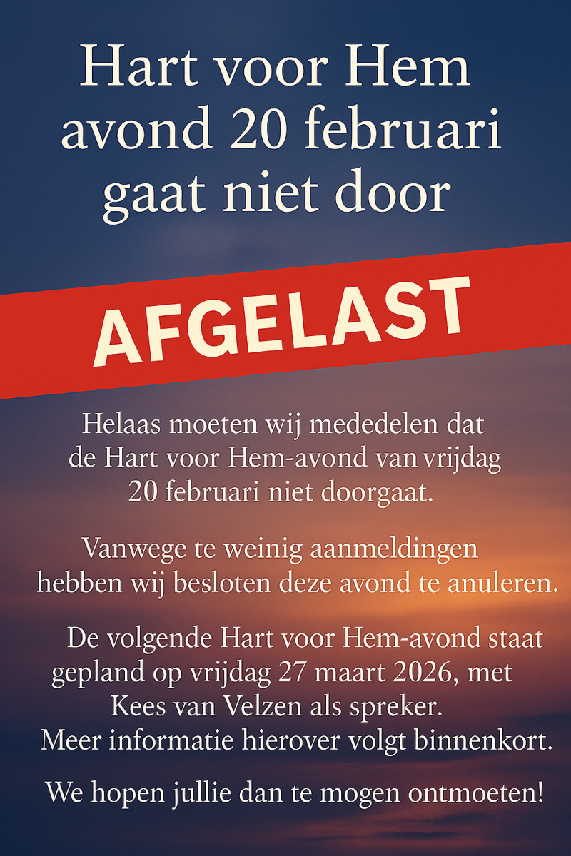 Helaas moeten wij mededelen dat de Hart voor Hem-avond van donderdag 20 februari niet doorgaat.